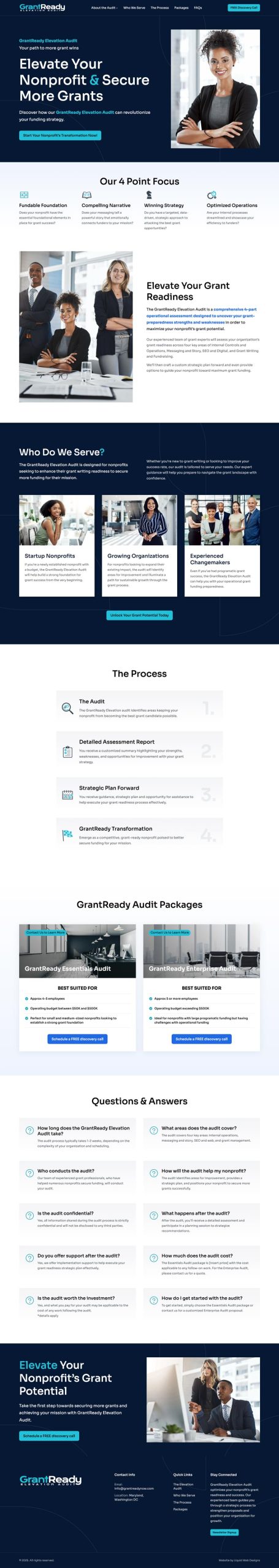 The Result: GrantReady launched with a cohesive, professional brand and a powerful digital presence from day one. The website effectively communicates the value of a complex service, positioning GrantReady as an authoritative and essential partner for any nonprofit looking to elevate its funding strategy and secure more grants.